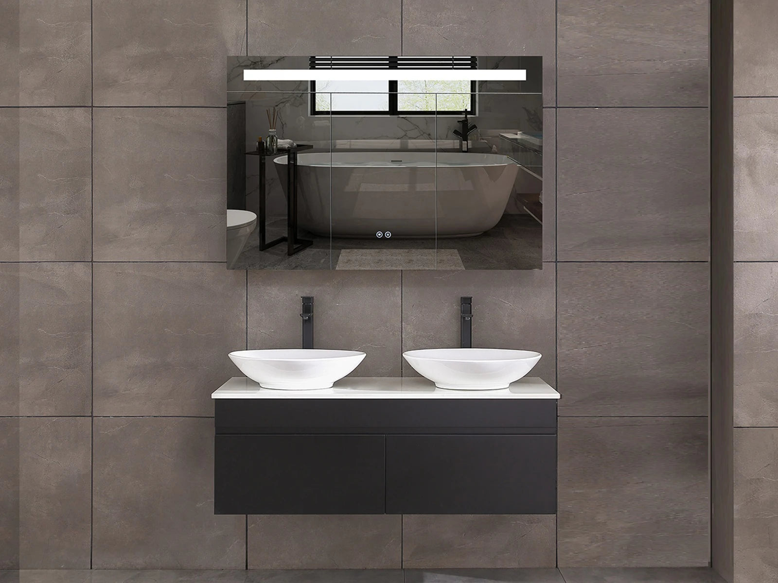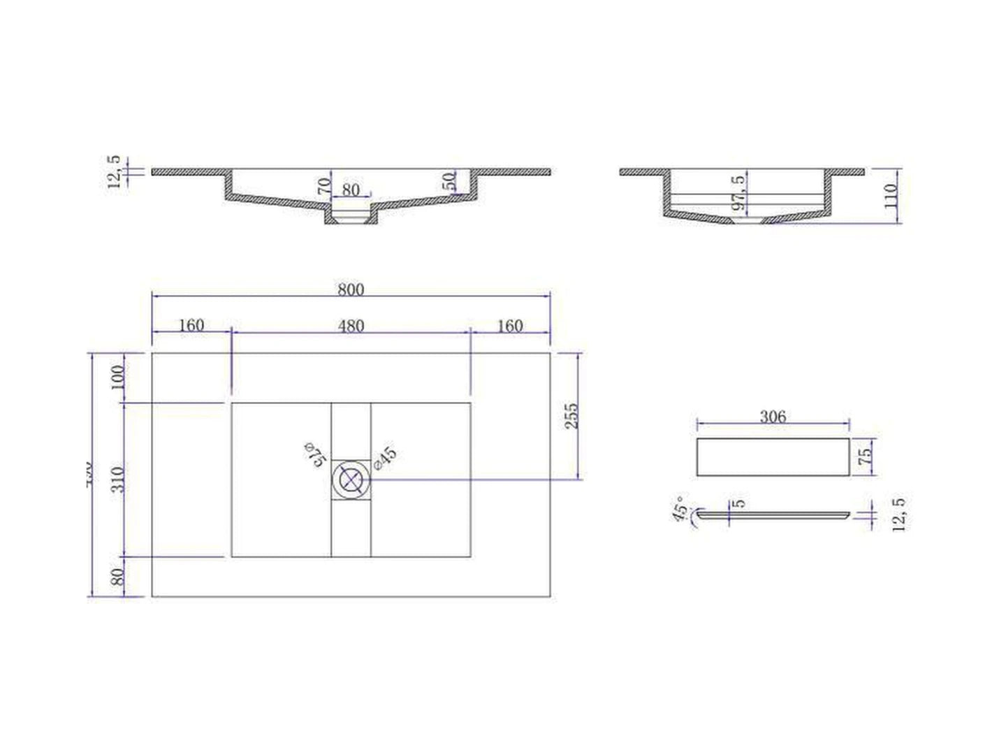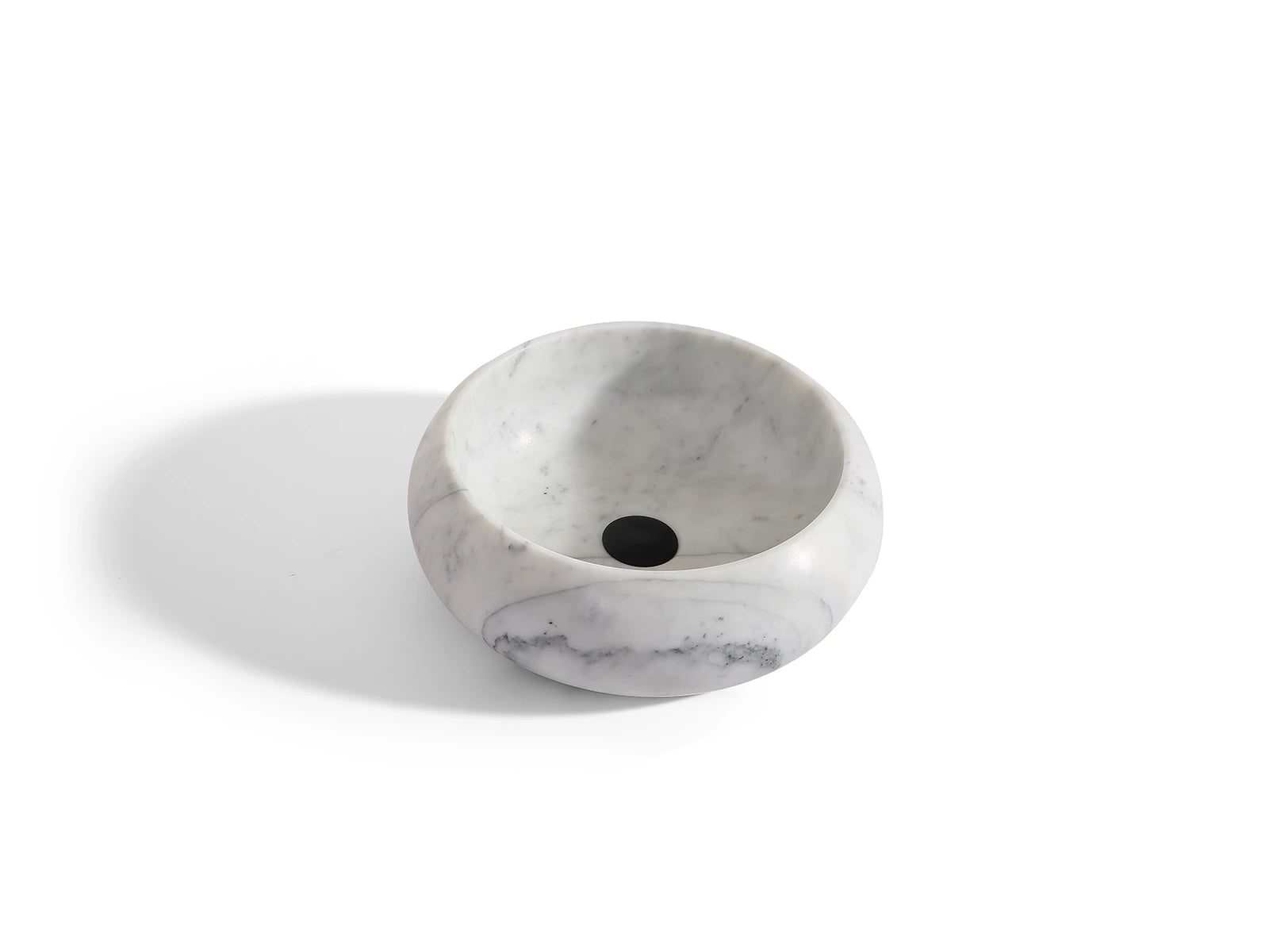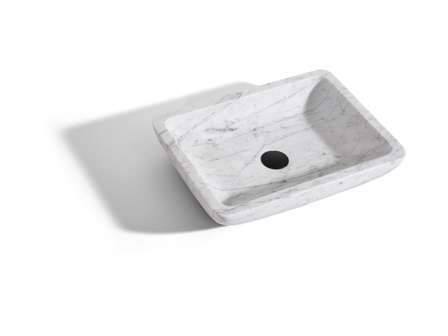 De wastafel beschikt over een verdekte afvoer in het midden van de wasbak.
