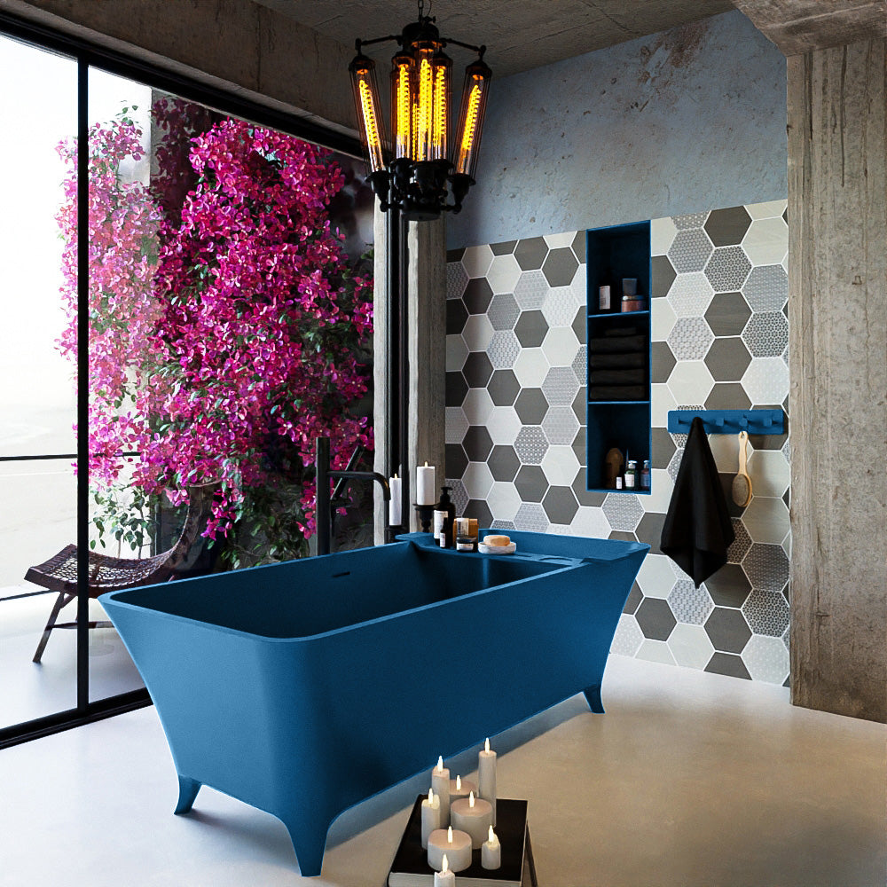 Een bad op pootjes die geweldig staat in elke badkamer. De vorm leent zich voor vrijstaand en half vrijstaand. Deze schitterende opstelling is gecombineerd met het badmeubel VICA zowel de Solid Surface wastafel als het meubel kan in exacte dezelfde kleur als het bad. Zo breng je kleur in je badkamer.
