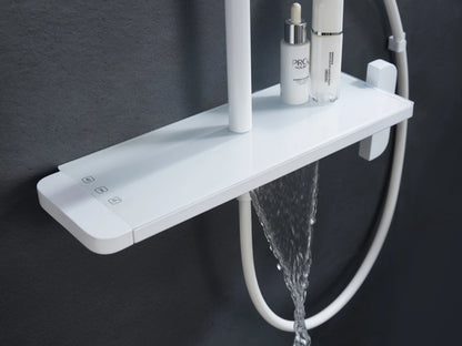 Voorzien van: badkraanuitloop. Handig gehard glazen planchet. Douchekop met kunststof wateruitlopen om gemakkelijk kalkaanslag te verwijderen.