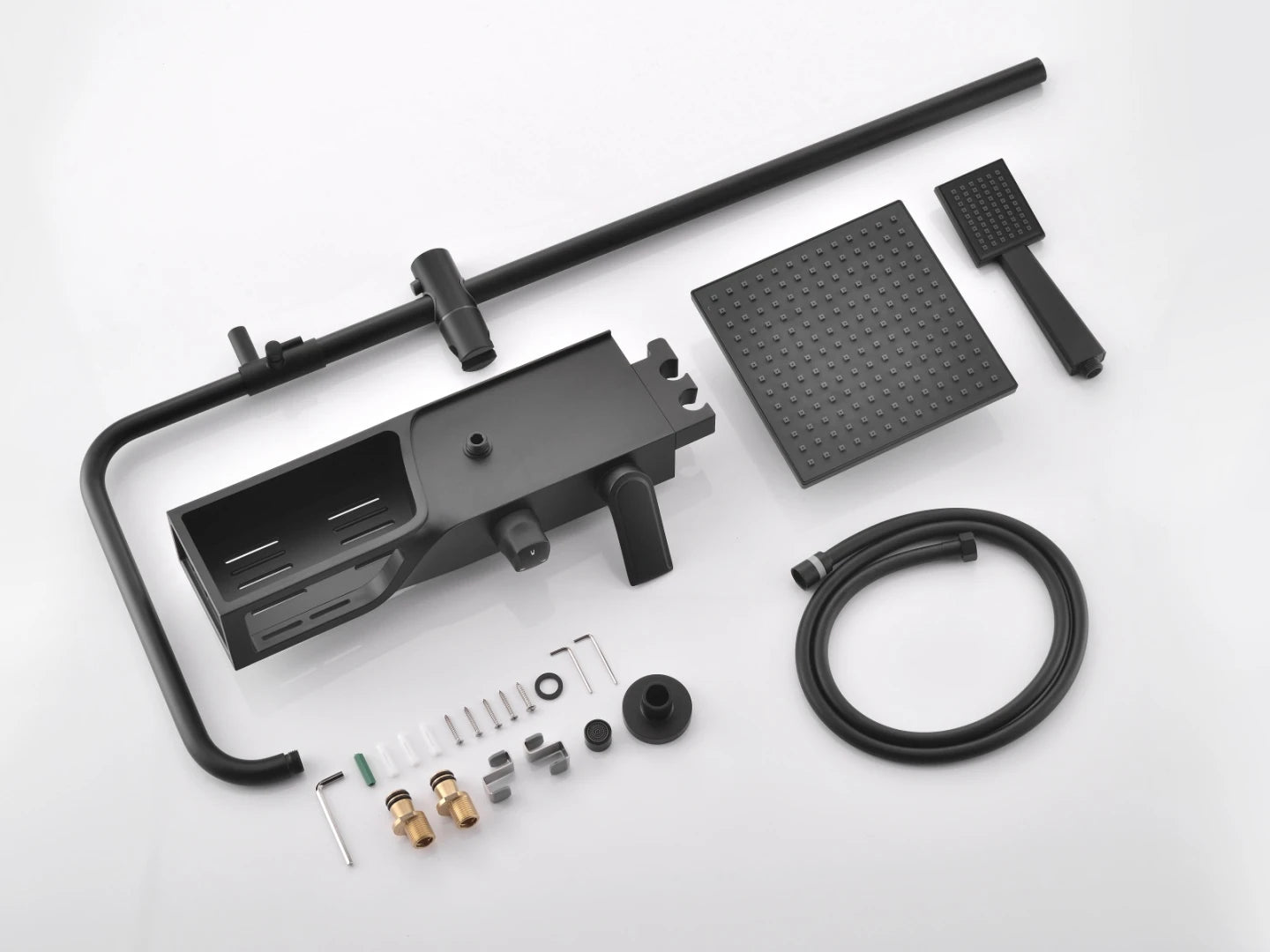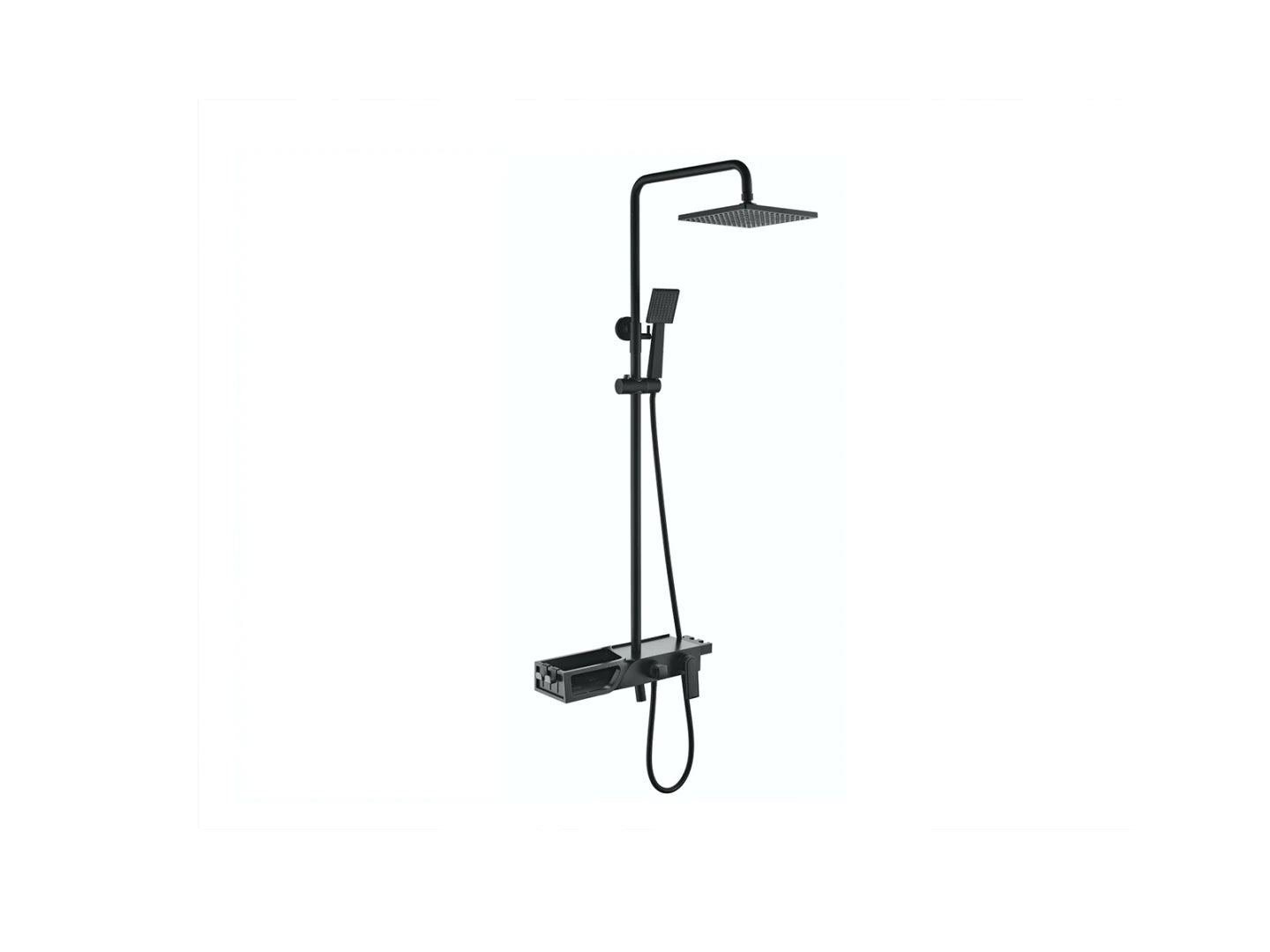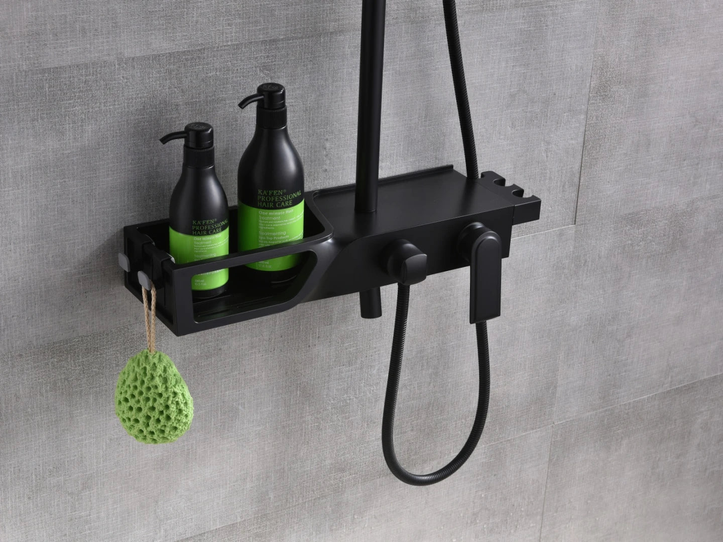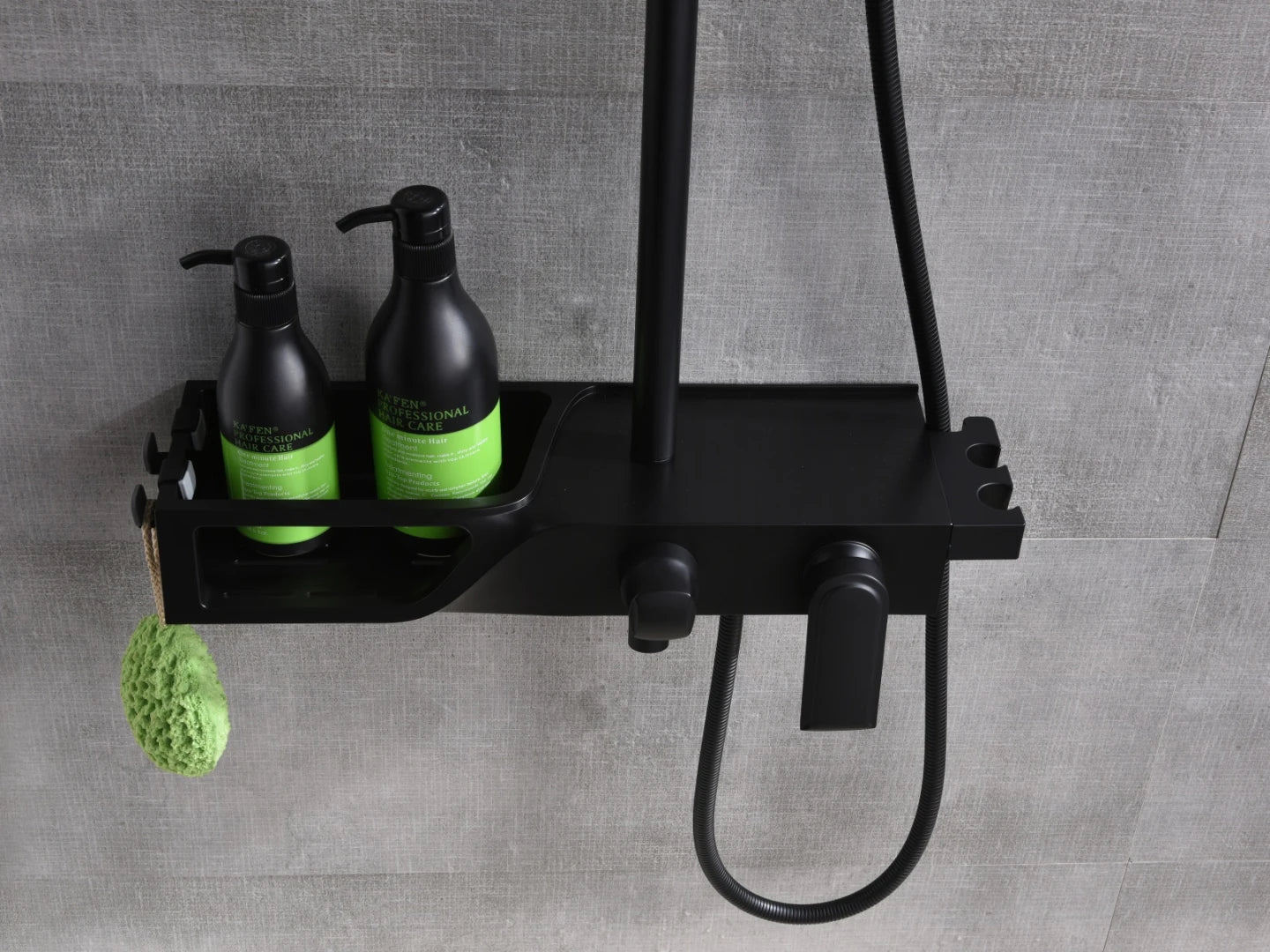 Ook heeft de doucheset een ingebouwd planchet met haakjes.